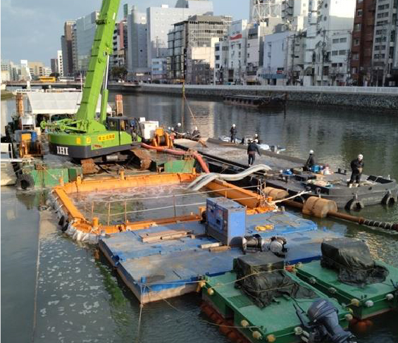 海上や河川での工事において、河川や港湾などの水底の土砂やヘドロを取り除く作業中に発生する濁りの拡散を防ぐために、汚濁防止膜を使用しています。