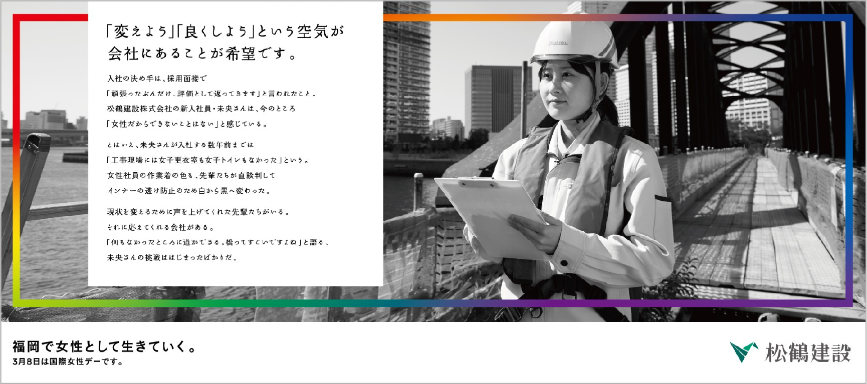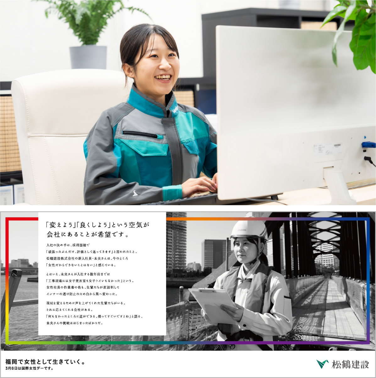 松鶴建設も、この法の趣旨に基づき、積極的に女性社員を採用し、「女性活躍推進法に基づく一般事業主行動計画」を策定して、女性が活躍できる職場環境の整備を行っています。