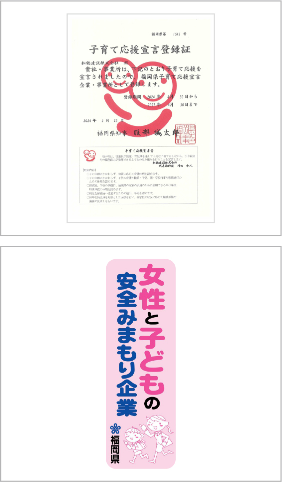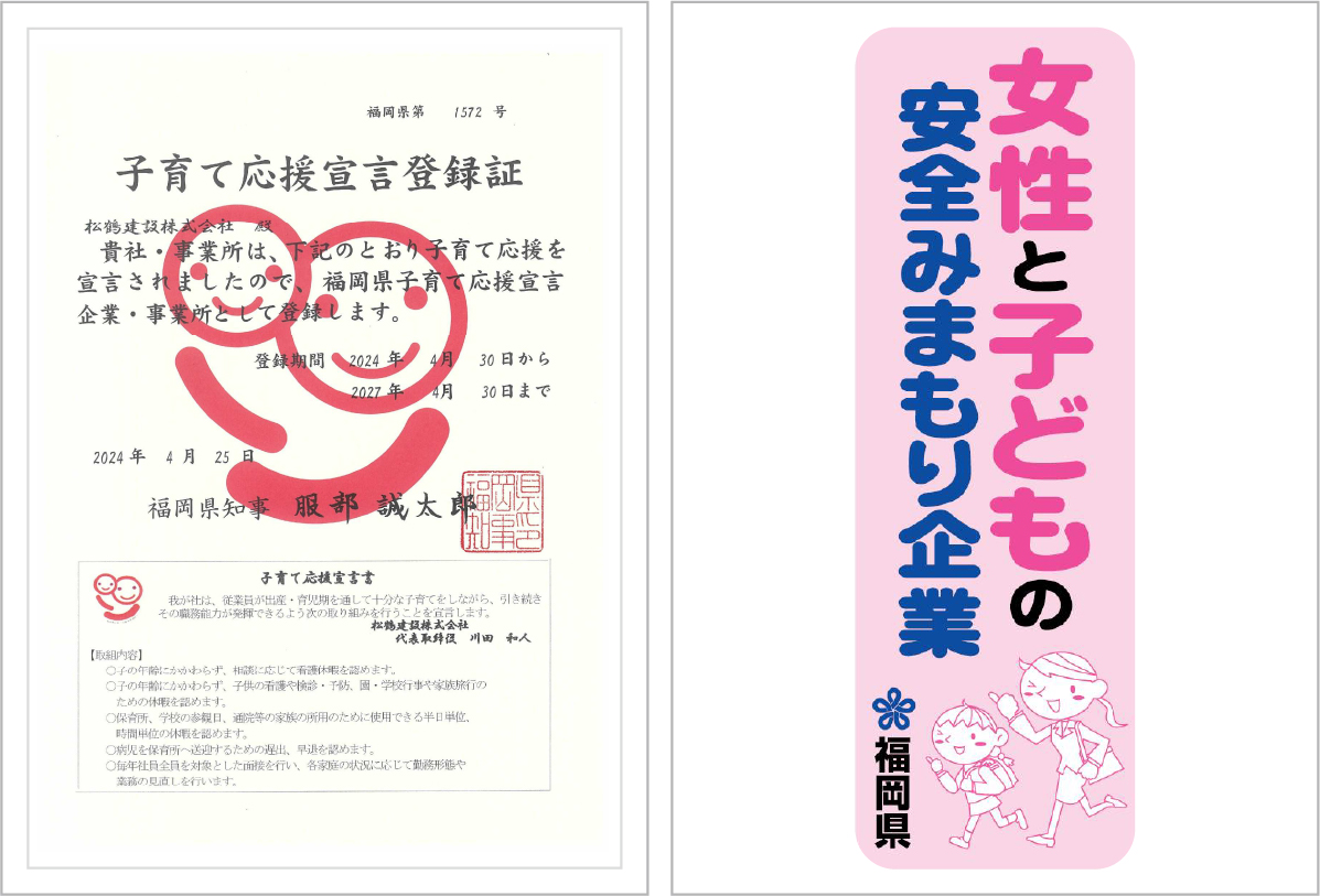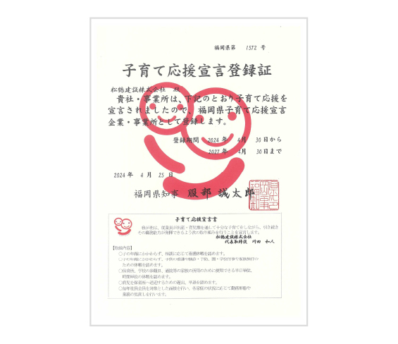 「次世代育成支援対策推進法」が施行されて以来、日本では少子化対策の一環として、子どもが健やかに育つ社会環境の整備が進められています。松鶴建設もこの方法に基づき、「次世代育成支援対策推進法に基づく一般事業主行動計画」を策定し、従業員が仕事と育児を両立できるよう、さまざまな支援策を実施しています。