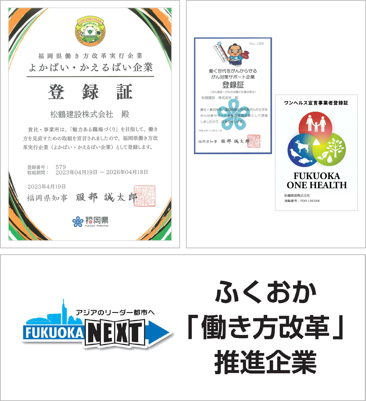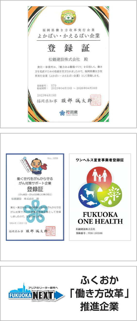 弊社が進めるSDGsへの取組みに対して西日本シティ銀行、福岡県、福岡市からSDGs宣言企業の認定を受けました。松鶴建設は、持続可能でよりよい社会の実現を目指すSDGsの目標に賛同しています。